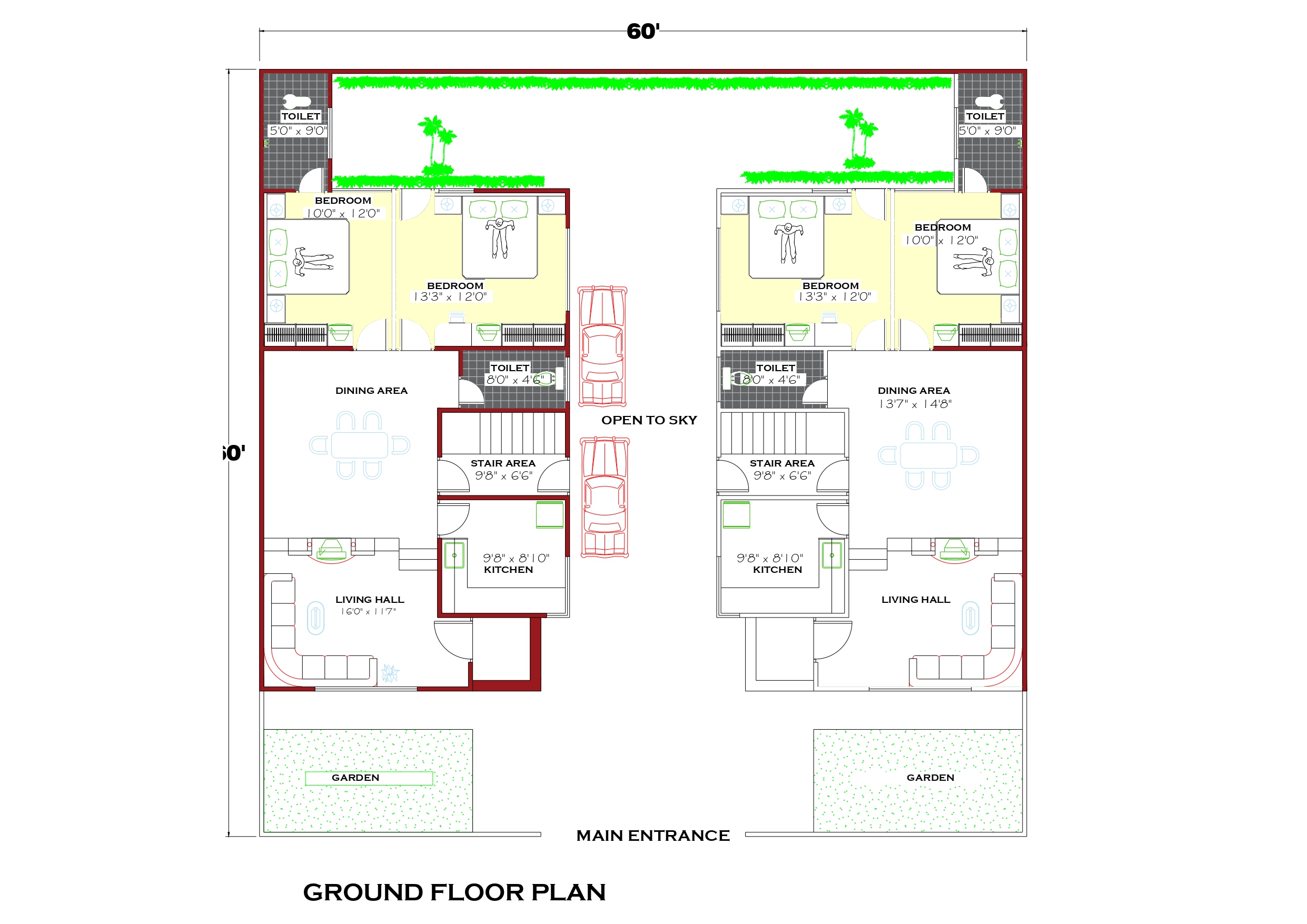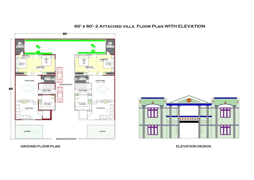 Plot Size: 60′ x 60′ – 02 Bedroom House Design 3BHK floor plan,