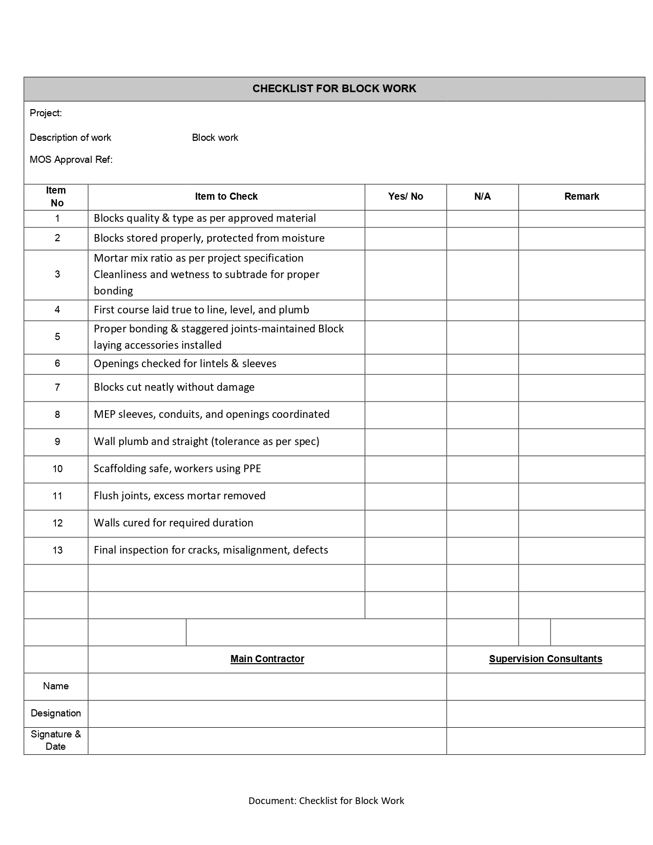 Click the button below to download the editable Word version of the Checklist for Block Work Template
