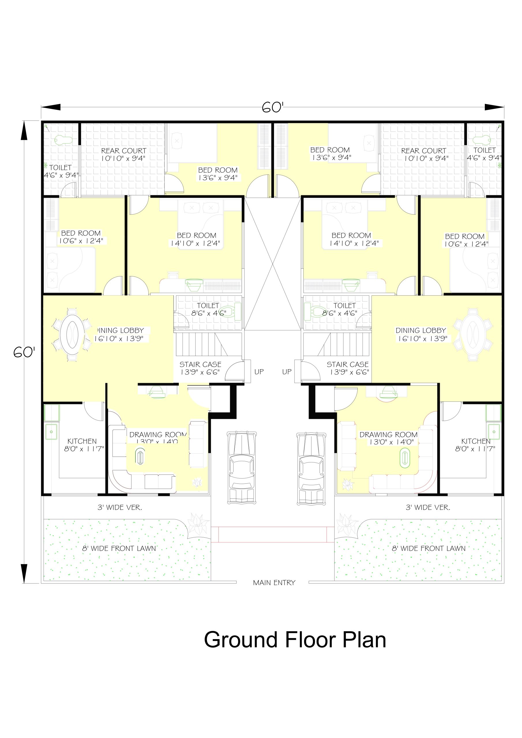 This modern duplex design features two symmetrical units on a 60’x60′ plot. Each unit includes spacious bedrooms, attached bathrooms, a dining lobby, drawing room, kitchen, and dedicated parking. With separate access and thoughtful layout, it’s ideal for joint families.