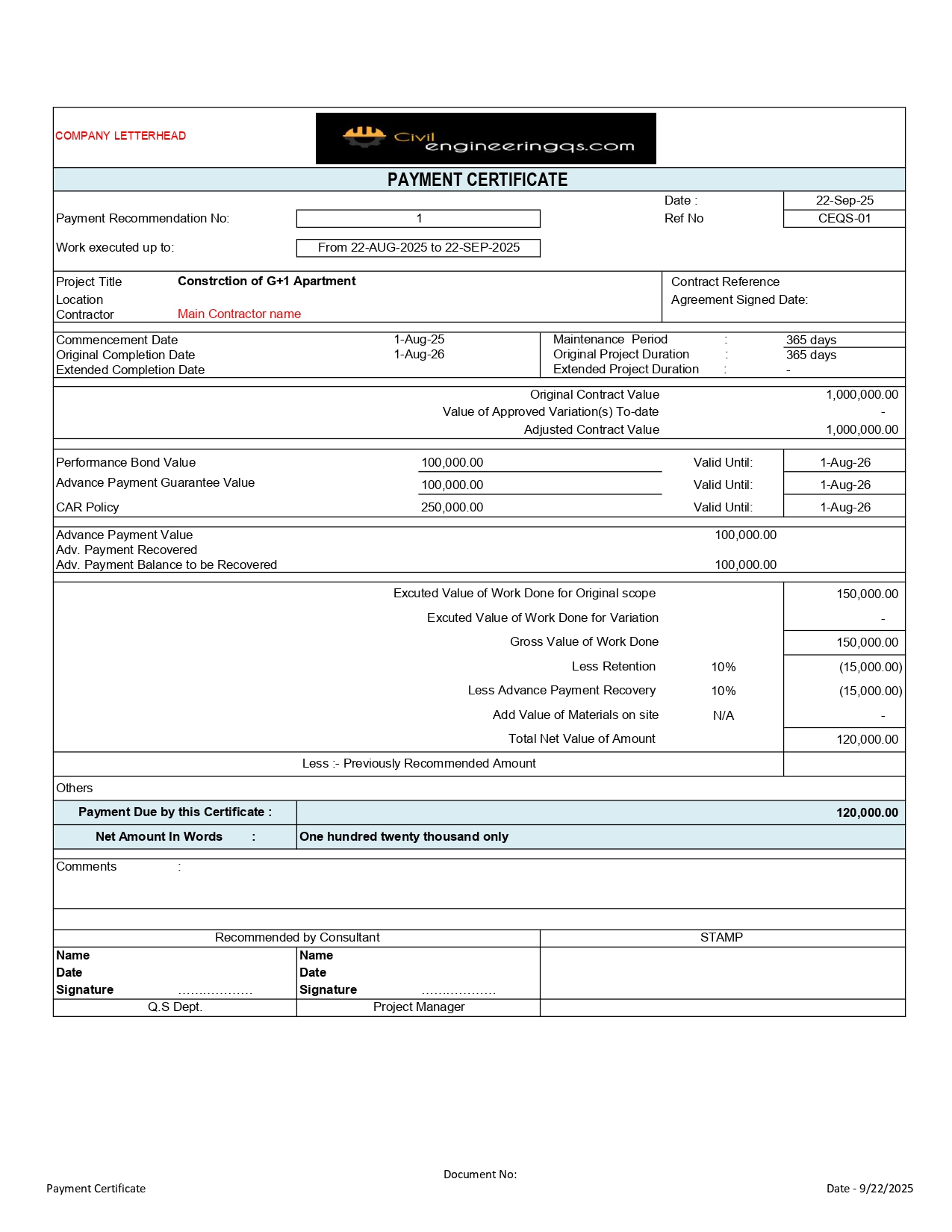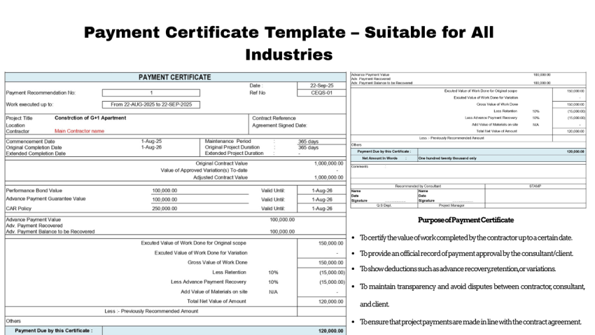 In construction projects, proper documentation of payments is important. A Payment Certificate provides a clear record of the value of work completed, advance recovery, retentions, and the net amount payable to the contractor. This ensures transparency between the contractor, consultant, and client.
