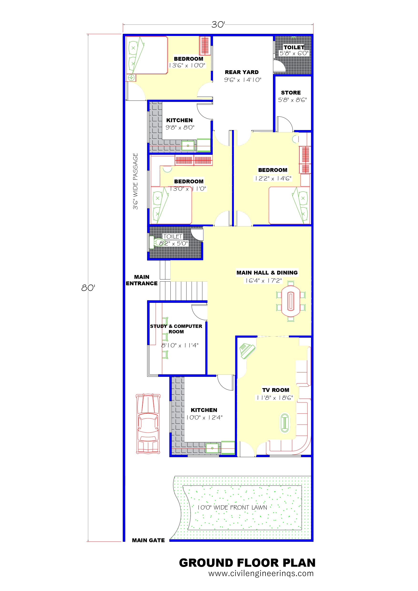 Plot Size: 30′ x 80′ -Approximate 2400 sqft
