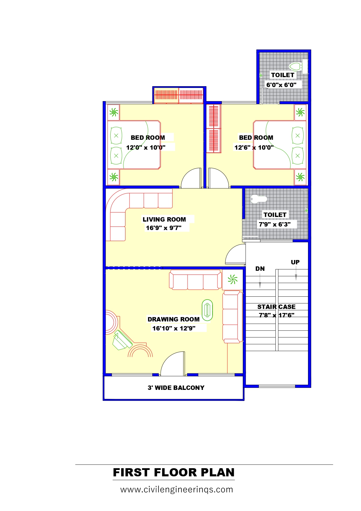 Bedroom 1 (Left): 12’0″ x 10’0″ – Located at the rear-left side. with attached Toilet 6’0″ x 6’0″