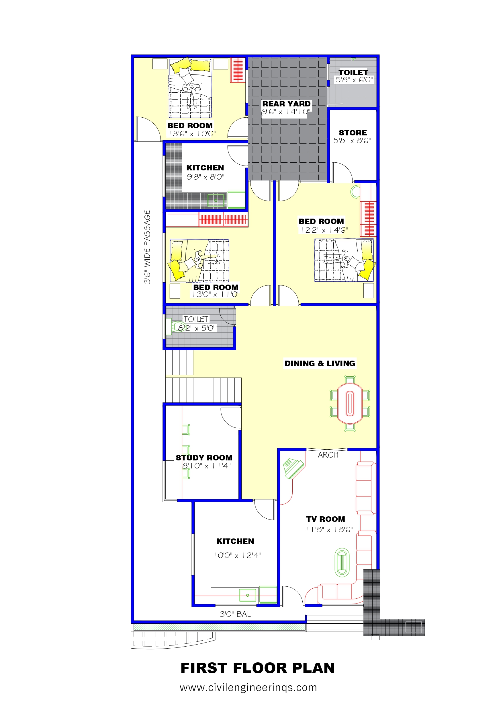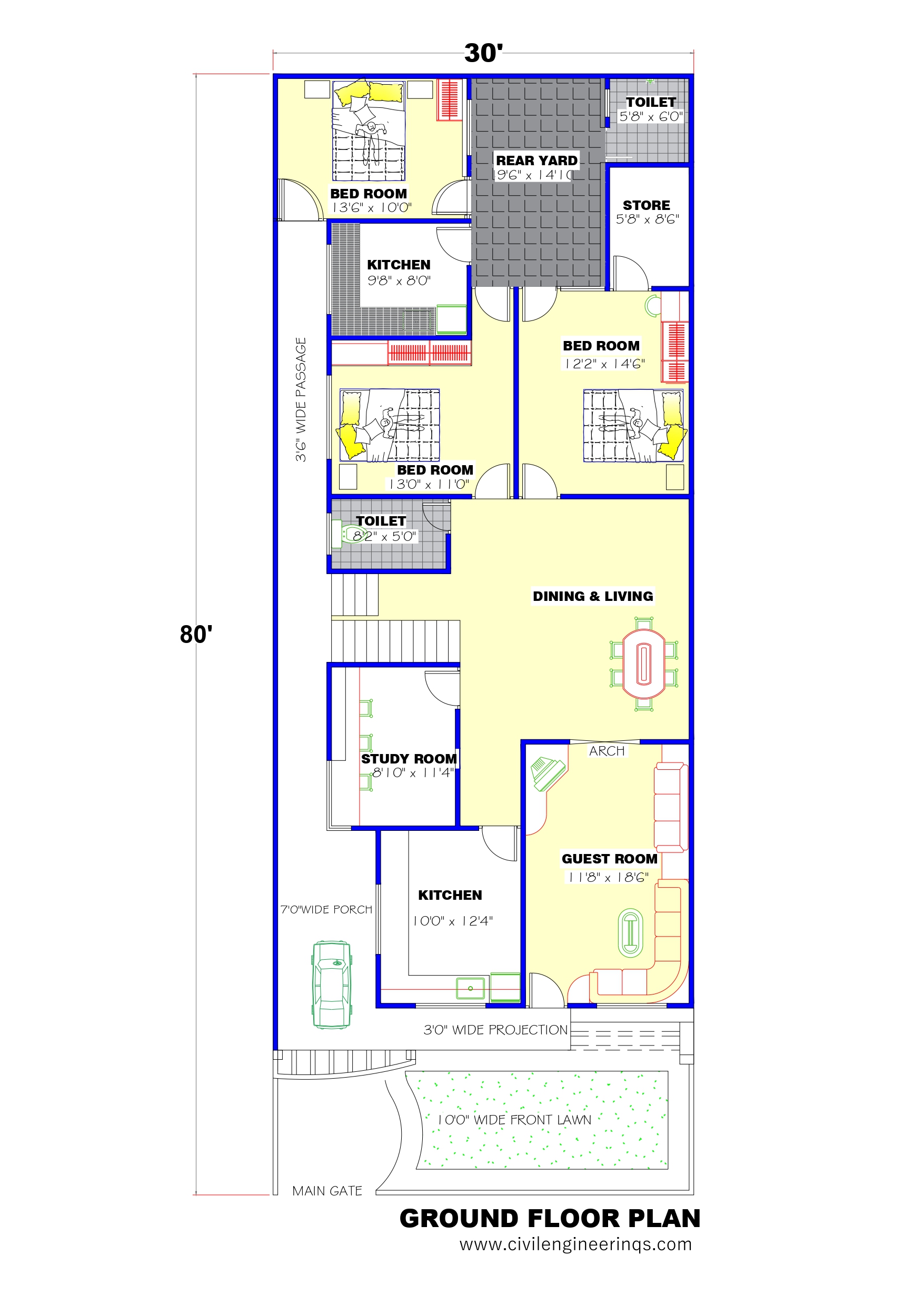 Plot Size: 30′ x 80′ – 04 Bedroom House Design, 7BHK including GF-3BHK+Guest Room & FF-3BHK